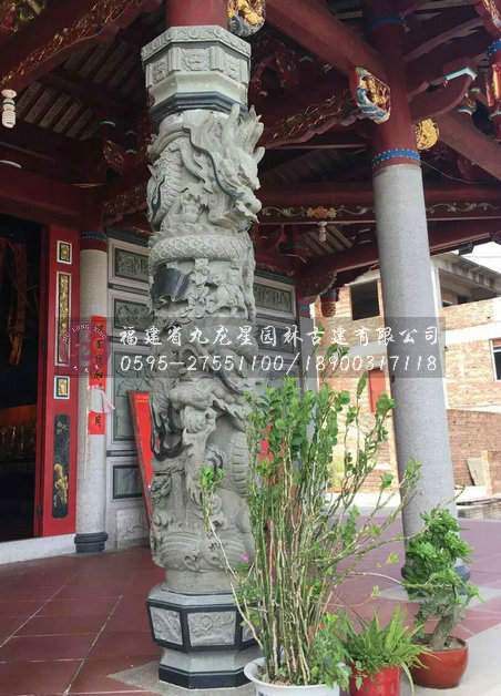 青石龍柱自清代以后大量出現(xiàn),因青石“韌”,宜精雕細(xì)刻。若按鏤雕深淺計算,具體可分為蟠龍柱、人物柱、花幕柱、八仙柱等;龍柱則又有淺浮雕與高浮雕之別,“白龍”柱基本是淺浮雕,而“青龍”基本是透析度極高的高浮雕。在龍的數(shù)量上區(qū)分,有單龍的盤繞柱,雙龍戲珠的柱子。而最為別致的是,“福龍”系列中聚成了閩南石雕龍柱的靈魂、寄托閩南人民的希望的“翻天覆地龍柱”。此外,可以按石柱本身的形狀分為方柱、八棱柱、六棱柱等等。