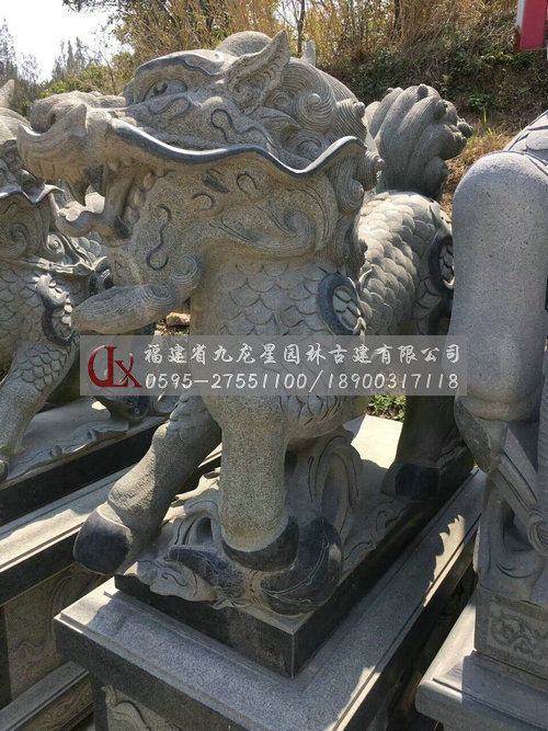麒麟造型中石刻麒麟多在建筑、皇家建筑里出現,其體型巨大,多以威武雄健之態出現。這說明,麒麟造型的比例尺寸大小是與特定的環境、風俗、情感相聯系的。石雕麒麟的大也可以解釋為大氣、圣威、權利,具有震懾的作用。石雕麒麟的造型遵循著傳統文化審美的習慣,麒麟的造型特征說明其造物意象充滿了對美好與吉祥的期望。石雕麒麟的整個造型集龍頭、鹿角、獅眼、虎背、熊腰、蛇鱗、馬蹄、豬尾于一身,另外使用添加手法在下頜處加有長長的胡須,又添加翅膀,這樣,麒麟可以奔跑,可以飛翔,威武之勢讓人可望不可及。麒麟體現了古人對現實世界的主觀理想與造物的主動性,其和龍、鳳一樣成了我國傳統民族精神的象征。還有,石雕麒麟的擺放一般是成雙成對出現的,主要因為其造型講究碩大豐滿,還注重陰陽相守,忌諱殘缺不全、形單影只,其中寄托了人們“天人和諧”的精神追求,內涵獨特而豐富。