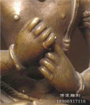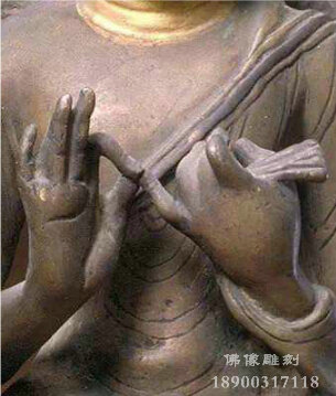 佛像的各種手勢(shì)代表佛像的不同身份,表示佛教的各種教義,是具有印度特點(diǎn)的人體語言,表達(dá)的含義極為豐富。常見的有說法印、無畏印、與愿印、降魔印、禪定印5種,即“釋迦五印”。手印形式可有多種變化,尤其是密教手印多達(dá)幾百種,變化莫測(cè),見的有智拳印、期克印等。