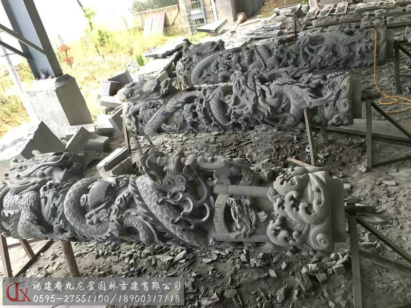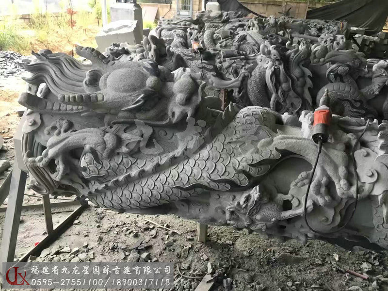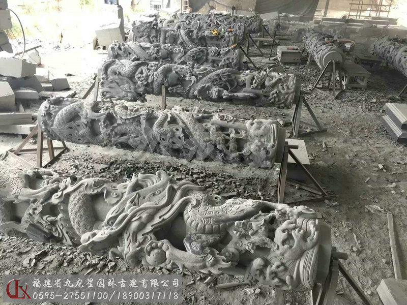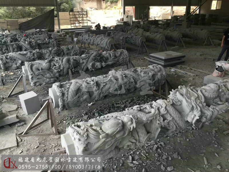 九龍星園林古建加工的寺廟石雕龍柱有單龍柱、雙龍柱、滾龍柱、盤龍柱、蟠龍柱、華表柱、龍鳳柱、八仙龍柱、青石龍柱等多種造型雕刻。我們通過專業且標準化的采購渠道,甄選優質的礦料,加工的寺廟石雕龍柱,大批量應用于寺廟建筑裝飾美化,贏得客戶好評。